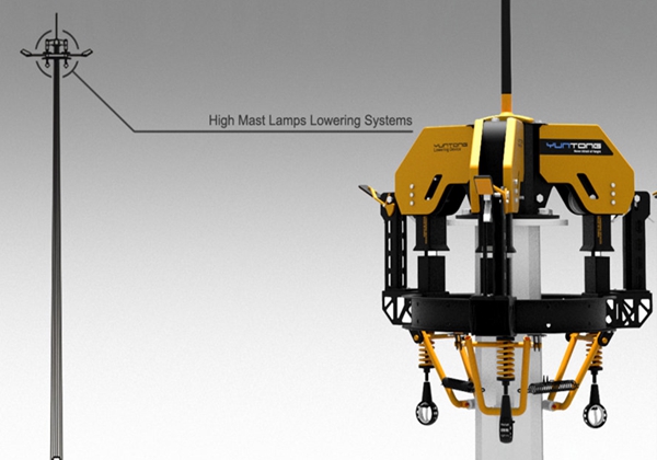 在設計升降系統時,主要是利用桿體底部的卷揚機,通過一根主鋼絲繩,帶動三根副鋼絲繩,主鋼絲繩的長度和副鋼絲繩的長度同高桿燈的高度大致相同,,三根副鋼絲繩的末端和高桿外側的燈盤相連接,這樣一來,主鋼絲繩在高桿燈內側,通過卷揚機啟動后,主鋼絲繩開始往下走,將外側固定在燈盤上的三根副鋼絲繩往上拉,直到燈盤掛上高桿燈最頂端的三個掛鉤。
